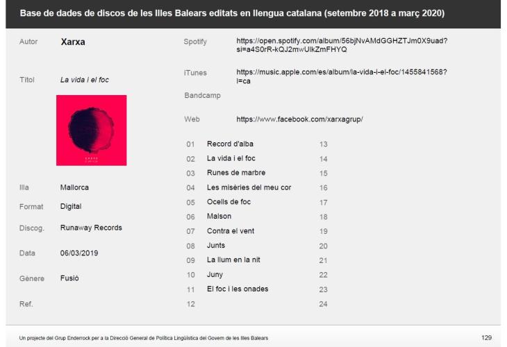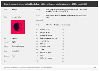 La base de dades recull els treballs publicats a les Balears entre el setembre de 2018 i el març de 2020. El catàleg, en format digital, es pot consultar a la pàgina web de Política Lingüística. S’hi recullen un total de 129 referències de treballs discogràfics, amb informació relativa al grup o solista com ara l’estil musical, l’illa de residència i les dades de contacte. Aquesta base de dades servirà per a crear un catàleg de tots els grups que canten en català a les Illes Balears.