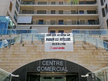 Arran ha desplegat aquest dilluns una pancarta al centre de Palma, en la qual es podia llegir «Fem que la crisi la paguin els hotelers. Ens hi va la vida».