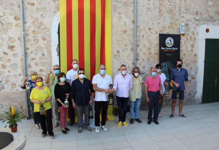 Després de la recepció, Torrent, amb membres d?Òmnium Cultural, Acció Cultural del País Valencià i l'Obra Cultural Balear han encès davant la façana del Palau del Parlament els quinqués.