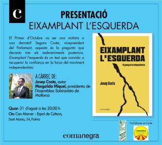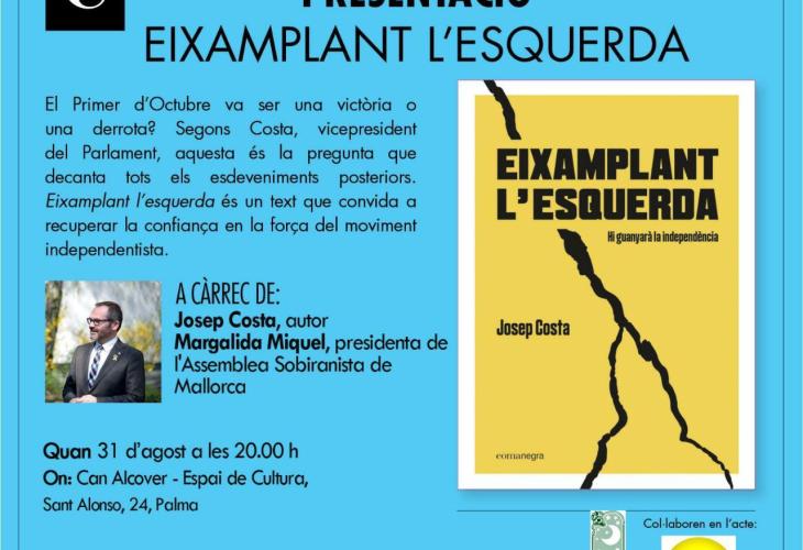 El vicepresident del Parlament de Catalunya, l'eivissenc Josep Costa, serà a Palma per parlar del seu nou llibre titulat 'Eixamplant l'esquerda'. Dia 31 d'agost, a partir de les 20.00 hores, serà a Can Alcover per fer la presentació del llibre, en un acte organitzat per l'Assemblea Sobiranista de Mallorca i presentat per la presidenta, Margalida Miquel.