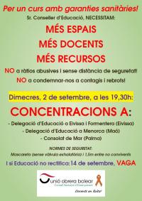 La Unió Obrera Balear, sectorial d'Ensenyament, convoca concentracions a Eivissa, Mallorca, Menorca el proper dia 2 de setembre, per a exigir a Educació que rectifiqui i aporti els espais i docents necessaris per a reduir ràtios i mantenir la distància de seguretat. Així mateix, la UOB reclama recursos sanitaris als centres per a vigilar la salut, atendre les incidències que es puguin produir i garantir la desinfecció dels espais, així com els docents i mitjans informàtics suficients en cas de passar a escenaris amb ensenyament telemàtic.
