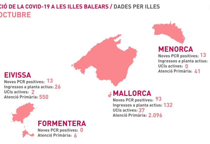 Per Illes, Mallorca lidera el nombre de PCR positives (93) mentre que a Menorca s'han notificat 13, igual que a Eivissa, i cap a Formentera. A Mallorca hi ha 132 pacients ingressats, 37 a UCI i 2.096 casos atesos per Atenció Primària. A Menorca hi ha tres pacients ingressats a planta, cap en UCI i hi ha 41 casos que són atesos per Atenció Primària. A Eivissa, el nombre d'ingressats a planta és de 26, dues a UCI i 550 pacients són atesos per Atenció Primària. A Formentera hi ha sis pacients que estan sent atesos per Atenció Primària.