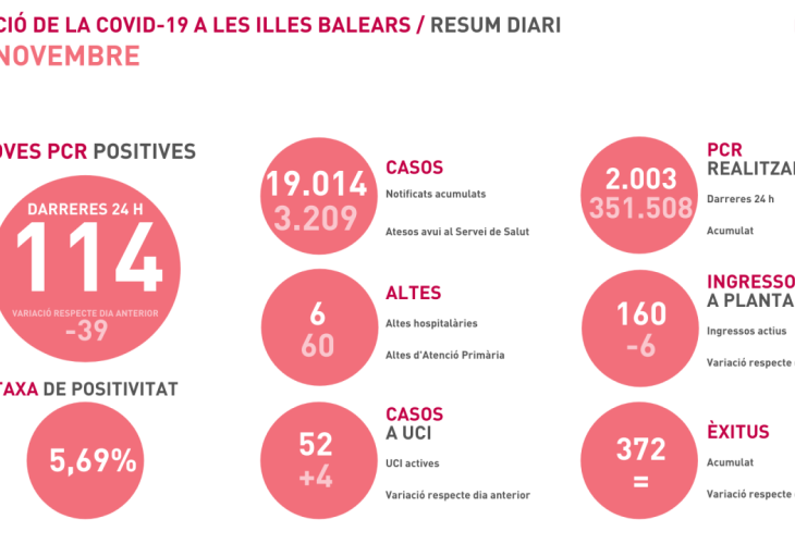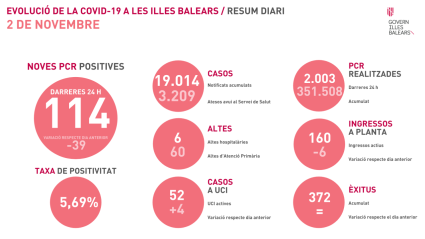 Per illes, a hores d'ara hi ha 108 ingressos en planta a Mallorca (42 UCI actives), a Eivissa són 51 els pacients ingressats (cinc UCI actives), mentre que a Menorca hi ha una persona ingressada en planta (cinc a UCI).