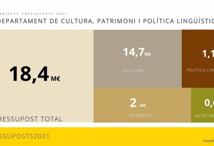 D'aquests 18,4 milions d'euros per a dinamitzar el sector cultural i la protecció del patrimoni i de la llengua, 14,7 corresponen a Cultura, dos milions a Patrimoni, 1,11 milions d'euros a Política Lingüística i 625.000 euros a la secretaria tècnica.