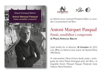 Dimecres, dia 18 d’octubre, a les 19 hores, tendrà lloc a la llibreria Lluna de Palma (General Riera 39B), la presentació del llibre ‘Antoni Marquet Pasqual. Passió, sensibilitat i compromís’ de Miquel Amengual Bibiloni (Lleonard Muntaner, Editor, 2023). Maria Victòria Secall és l’encarregada del pròleg.