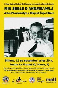 La primera novel·la de Miquel Àngel Riera, Fuita i martiri de Sant Andreu Milà, compleix enguany mig segle de la seva publicació; l’efemèride serveix, doncs, per a homenatjar al seu autor amb un acte que tendrà lloc al Teatre La Fornal (Manacor) el pròxim dilluns, 11 de desembre, a les 20 hores i en el qual participaran Pere Rosselló Bover, Bernat Nadal, Maria Magdalena Gelabert, Lluís Segura, Josep Ramon Santiago, Tomeu Canyelles i la família Riera-Vallés.