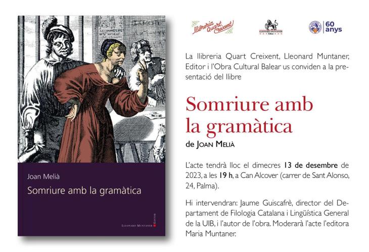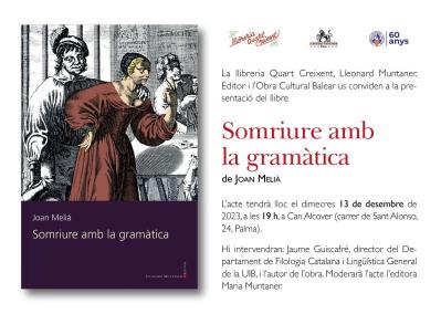 Aquest dimecres, 13 de desembre, la llibreria Quart Creixent, Lleonard Muntaner Editor i l'Obra Cultural Balear han organitzat un acte per presentar el llibre de Joan Melià 'Somriure amb la gramàtica', editat per Lleonard Muntaner Editor.