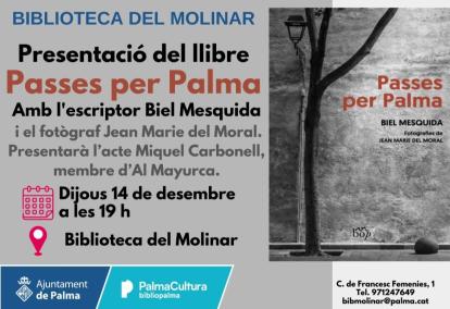 Aquest dijous, 14 de desembre, a les 19.00 hores, a la sala Aurora Picornell de la Biblioteca Municipal del Molinar, el poeta i escriptor Biel Mesquida presenta el seu nou llibre 'Passes per Palma', amb fotografies de Jean Marie del Moral, i editat per Vibop Edicions. A l'escriptor i al fotògraf els acompanyarà Miquel Carbonell, veí del Molinar, activista social i membre del grup musical Al-Mayurqa.