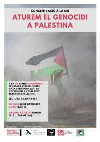 El col·lectiu UIB per Palestina ha organitzat per al pròxim dilluns, 18 de desembre, a les 14.00 hores, un acte en solidaritat amb Palestina. Serà davant l'edifici Ramon Llull del campus universitari i comptarà amb el suport de col·lectius com l'Institut d'Antropologia de les Illes, Ciutadans per Palestina, Mallorca per Palestina i BDS Mallorca.
