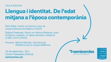 L'entitat que treballa per promoure la llengua catalana com a eina de la cohesió social Plataforma per la Llengua ha organitzat la taula rodona 'Llengua i identitat. De l'edat mitjana a l'època contemporània', a càrrec de Pere Salas, Doctor en Història i autor de 'L'espanyolització de Mallorca' (2020) i Gabriel Ensenyat, Doctor en Història Medieval i autor de 'Moros i catalans. Un debat identitari a Mallorca (1969-1972)' (2023) i presentada per Marina Garcias, voluntària de Plataforma per la Llengua Mallorca.