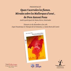 'Quan t’acorralen les flames. Mirades sobre les Mallorques d’avui', el llibre del periodista i escriptor campaner Pere Antoni Pons, publicat el passat setembre per Edicions Tres i Quatre; es presenta el dimarts 19 de desembre, a les 20.00 hores, a l'Espai Passatemps, carrer Marquès de la Fontsanta, 11, de Santa Maria del Camí.