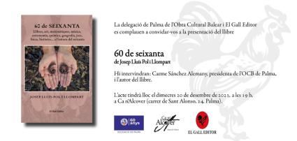 Avui dimecres, dia 20 de desembre, a les 19 hores, la delegació de Palma de l’Obra Cultural Balear i El Gall Editor ens conviden a la presentació de 60 de SEIXANTA de Josep Lluís Pol i Llompart.