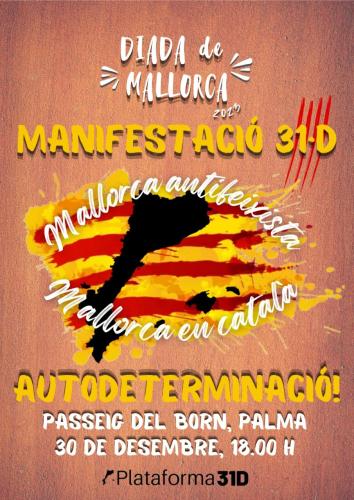 El dissabte 30 de desembre a partir de les 18.00 hores es farà la manifestació de la Diada de Mallorca. Enguany començarà al Passeig del Born de Palma i acabarà a la plaça del Tub, on s'hi farà l'acte polític amb les intervencions dels dos blocs convocants, el de l'Esquerra Independentista i el de la Plataforma Unitària 31D.