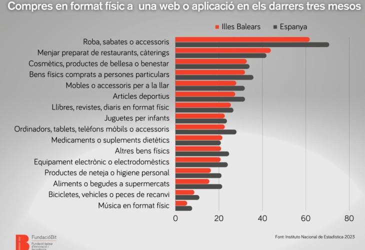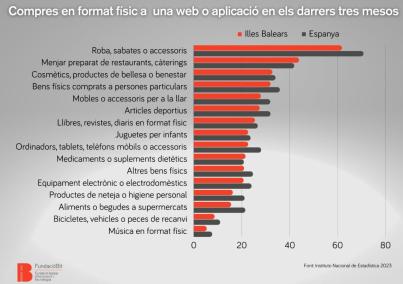Així mateix, i pel que fa al tipus de compres, els productes més adquirits pels compradors de les illes són la roba, sabates i accessoris, amb un 61,8 %; el menjar preparat, amb un 43,9 %; i els cosmètics, i productes de bellesa o benestar amb un 32,8 %. Altrament, també és destacable que un 32 % dels enquestats afirma haver comprat béns físics a persones particulars, un fet que també indica un canvi tant en els hàbits de consum, com en la digitalització de la ciutadania.