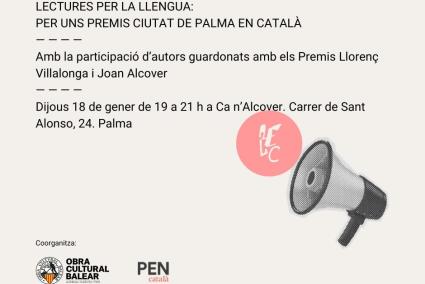L'Obra Cultural Balear (OCB), l'Associació d'Escriptors en Llengua Catalana (AELC) i el PEN Català organitzen aquest dijous 18 de gener a Can Alcover (19.00 hores) un acte de protesta en contra de la decisió de l'Ajuntament de Palma d'incorporar el castellà a les modalitats de novel·la i poesia en els Premis Ciutat de Palma.