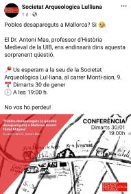 La conferència 'Pobles desapareguts (o gairebé desapareguts) a Mallorca durant l'edat mitjana', d'Antoni Mas, professor d'Història Medieval a la Universitat de les Illes Balears (UIB), es durà a terme el pròxim dimarts 30 de gener, a les 19.00 hores, a la Societat Arqueològica Lul·liana, ubicada en el carrer de Monti-sion número 9 de Palma.