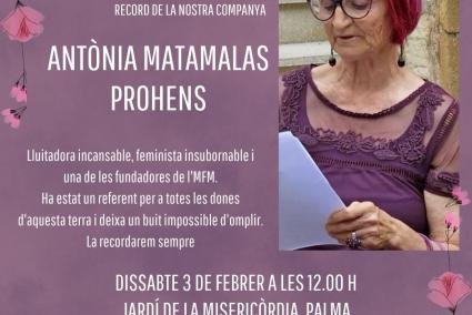 El passat dimarts, 23 de gener, va morir Antònia Matamalas Prohens, dona destacada de la societat civil manacorina, feminista fundadora del col·lectiu Dones de Llevant i del Moviment Feminista de Mallorca.