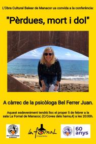 El proper dilluns, 5 de febrer, l'Obra Cultural Balear (OCB) de Manacor organitza la conferència 'Pèrdues, mort i dol', a càrrec de Bel Ferrer Juan, psicòloga i pedagoga especialista en processos del dol.