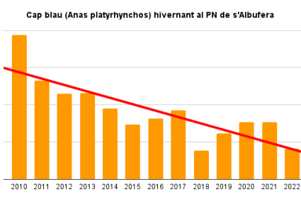El canvi ambiental que està patint la zona humida no afecta exclusivament a la vegetació, sinó al conjunt de l’ecosistema. Les poblacions d’aus aqüàtiques són un element molt destacat de l’Albufera, i també estan essent afectades per la crisi ambiental. Per il·lustrar amb un exemple, el 2010 el cap blau (Anas platyrhynchos) era l’espècie d’ànnera més abundant a l’Albufera, amb uns efectius hivernals de prop de 4.000 exemplars. Actualment la seva població hivernant n’és aproximadament una quarta part, amb una tendència clarament regressiva.