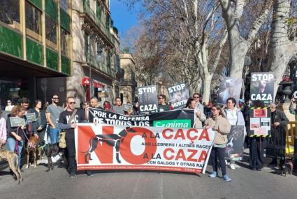Més d'una trentena de persones s'han manifestat aquest diumenge a Palma, així com en altres 80 ciutats, convocades per la Plataforma No a la Caça (NAC), per dir un «no rotund a la caça amb cans» i exigir a més la inclusió dels cans de caça en la Llei de Benestar Animal estatal.