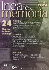 Sota el títol 'Inca té memòria', l'Ajuntament d'Inca ha impulsat, un any més, un programa d'actes orientats a recuperar i difondre la memòria històrica de la ciutat. Enguany el cicle té com a eix central l'acte d'homenatge a les víctimes de la Guerra Civil i el franquisme que se celebra aquest dissabte, 24 de febrer, al Claustre de Sant Domingo.