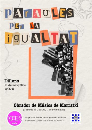 Dilluns, dia 11 de març, a les 19.30 h, tendrà lloc l’acte ‘Paraules per la Igualtat’. Això serà a l’Obrador de Músics de Marratxí (Camí de sa Cabana, 1 es Pont d’Inca).