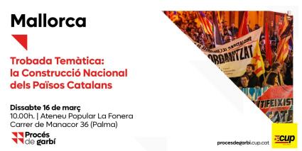 Aquest dissabte, a les 10 h, a l'Ateneu Popular La Fonera (Palma) hi haurà una trobada temàtica del Procés de Garbí de la CUP per a parlar de construcció nacional. «A Mallorca tenim molt a dir sobre com volem construir els Països Catalans des de la Unitat Popular», han assenyalat.