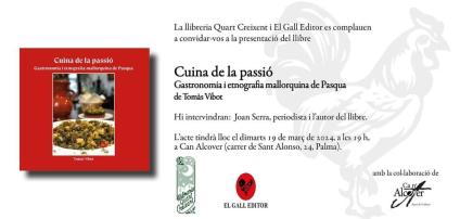 La llibreria Quart Creixent i El Gall Editor organitzen la presentació del llibre 'Cuina de la passió. Gastronomia i etnografia mallorquina de Pasqua, del polifacètic escriptor mallorquí Tomàs Vibot, i editat per El Gall Editor.