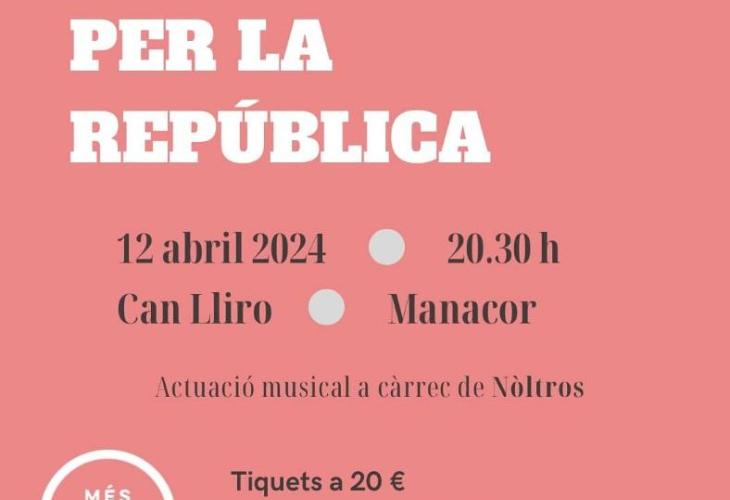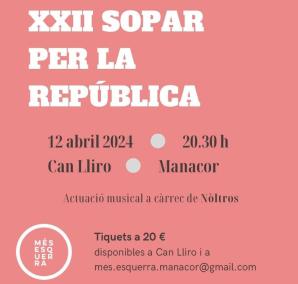 El tradicional Sopar per la República, organitzat per MÉS Esquerra Manacor, arriba a la XXII edició. Enguany, es farà el 12 d'abril, a les 20.30 hores, a Can Lliro.