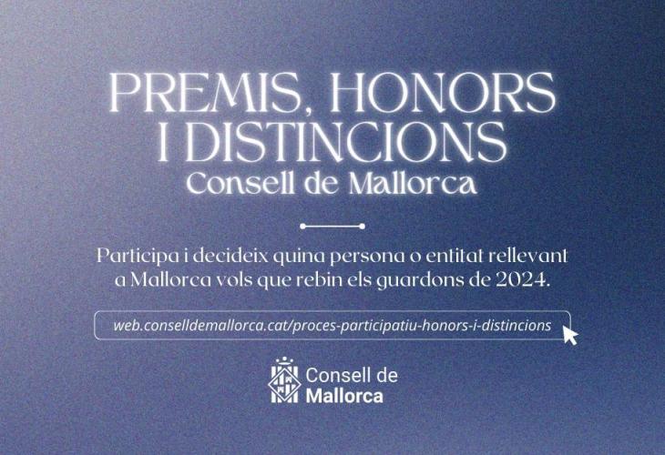 El Consell de Mallorca ha obert aquest dilluns el procés participatiu per a presentar les candidatures dels Premis, Honors i Distincions que se celebraran el 12 de setembre. D'aquesta manera, la ciutadania i els ajuntaments podran emplenar el formulari habilitat amb les seves propostes en la web de la institució insular fins al dia 17 de maig.