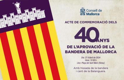 El Consell de Mallorca commemora, aquest dissabte, 27 d'abril, el 40è aniversari de l'aprovació de la bandera oficial de Mallorca. L'acte institucional, que es durà a terme a la plaça de Sant Marc de Sineu, recordarà l'acord del ple del 2 de gener de 1984 pel qual es va aprovar la bandera de l'illa.
