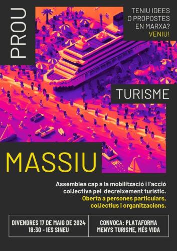 Així, les entitats que formen part de la Plataforma convoquen aquesta reunió per a preparar la mobilització i acció col·lectiva pel decreixement turístic. Serà el 17 de maig, a les 18.30 hores, a l'IES de Sineu.