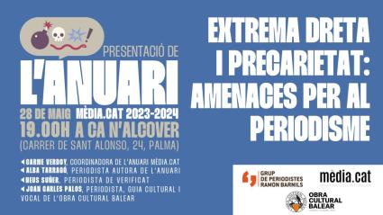 L'acte de presentació, organitzat conjuntament amb l’Obra Cultural Balear, tendrà lloc a les 19 h i Hi intervendran la Carme Verdoy, editora de Mèdia.cat i coordinadora de l’Anuari; l’Alba Tarragó, periodista i autora del reportatge de l’Anuari Mitjans més febles i gabinets més forts: l’Administració posa en escac el periodisme a les Illes, Neus Suñer, periodista de Verificat i Joan Carles Palos, periodista i vocal de l’Obra Cultural Balear.
