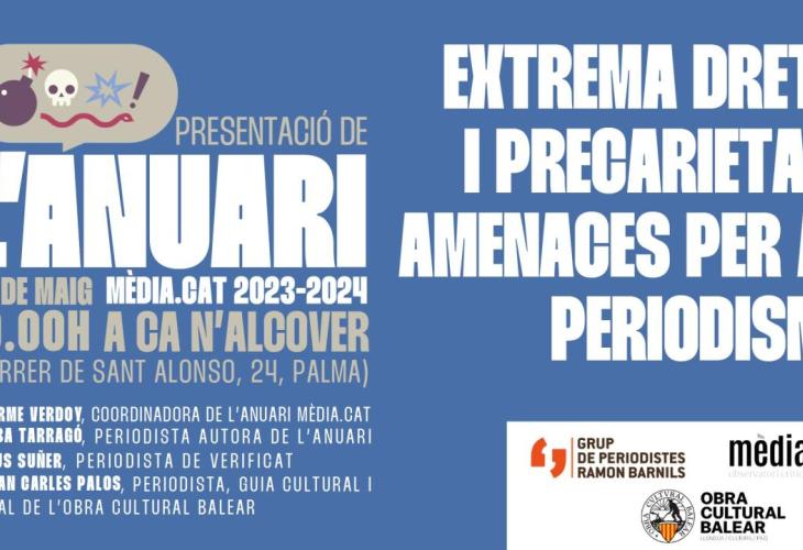 La 13a edició de l’Anuari de Mèdia.cat, la publicació en paper de l’Observatori Crític dels Mitjans Mèdia.cat, impulsat pel Grup de Periodistes Ramon Barnils, es presentarà dimarts, 28 de maig, a Can Alcover, Palma. Aquesta nova edició de l’Anuari se centra sobretot en què pot fer el periodisme per respondre a l’extrema dreta, un fenomen que cada vegada va més a l’alça. I també inclou un reportatge d’Alba Tarragó sobre com l’Administració i l’enfortiment dels gabinets de comunicació posa en escac el periodisme a les Illes.