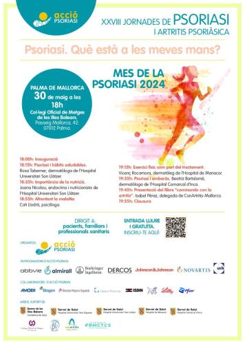 Aquest dijous, dia 30 de maig, a les 18 hores, tendran lloc al Col·legi Oficial de Metges de les Illes Balears (passeig de Mallorca, 42 de Palma) les XXVIII Jornades de psoriasi i artritis psoriàsica, amb el lema «Psoriasi. Què està a les meves mans?» L’acte va dirigit a pacients, familiars i professionals sanitaris. Tot i que l’entrada és lliure i gratuïta cal inscriure’s al codi QR.