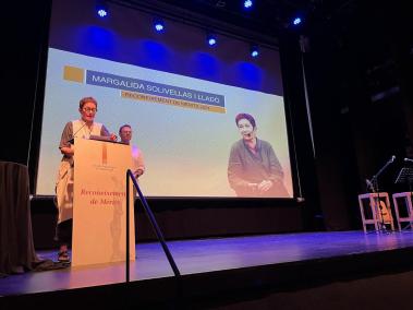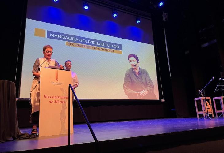 L’acte d’entrega del Reconeixement de Mèrits 2024 ha arrencat amb una píndola teatralitzada sobre la trajectòria i la vida de Margalida Solivellas, amb la música i l’admiració pels Beatles com a fil conductor. L’actriu Marina Nicolau i el músic Roger Pistola han posat la part més íntima a la cerimònia, que també ha comptat amb el testimoni audiovisual de periodistes d’arreu dels territoris de parla catalana, com ara Toni Cruanyes, la corresponsal de TV3 al País Valencià Pepa Ferrer, el periodista eivissenc Toni Escandell, la periodista mallorquina Neus Albis, la periodista formenterenca Aina Mayans, la corresponsal de TV3 a la Vall d’Aran Jovita Ané o el periodista menorquí Josep Bagur.