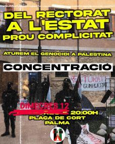 L'Acampada per Palestina a la UIB ha convocat aquest dimecres una concentració, a Palma, a les 20.00 hores a la Plaça de Cort, «contra la complicitat del rectorat amb el genocidi».