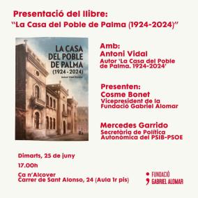 Aquest dimarts, dia 25 de juny, a les 17.00 hores, tendrà lloc a Ca n’Alcover (carrer de Sant Alonso, 24 Aula 1r pis) la presentació del llibre La Casa del Poble de Palma (1924-2024) d’Antoni Vidal Nicolau (Illa Edicions, febrer de 2024, col·lecció Mar de Fons núm. 14)