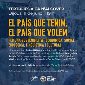 L'Obra Cultural Balear (OCB) organitza el pròxim dijous, 11 de juliol, a les 19 h la tertúlia 'El país que tenim, el país que volem' a Can Alcover (Palma). El col·loqui tractarà sobre la sostenibilitat, ja sigui econòmica, social, ecològica, lingüística o cultural.