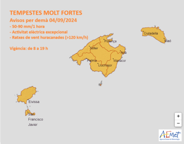 Les Balears es troben aquest dimecres en alerta taronja per pluges i tempestes, mentre que Tarragona, Castelló i València registraran avisos taronja de pluges i groc de tempestes.