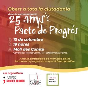 Enguany es compleixen 25 anys del Pacte de Progrés i la Fundació Gabriel Alomar, les Fundacions Darder-Mascaró i el col·lectiu Aurora Picornell han anunciat una commemoració unitària d’aquest fet històric el pròxim 13 de setembre. L'acte servirà per a «realçar tota la feina feta pel primer Executiu progressista de la democràcia, però també per a ressaltar una forma de fer política basada en el diàleg, en l’acord i en l’entesa entre forces polítiques diferents per a millorar la vida de la ciutadania».