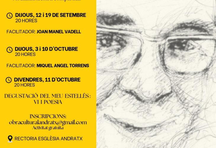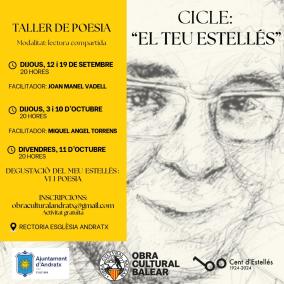 L’Obra Cultural Balear d’Andratx ha organitzat un taller de poesia en el marc del cicle 'El teu Estellés', amb modalitat de lectura compartida i degustació de vi. L'activitat és gratuïta però cal inscriure's a l'adreça obraculturalandratx@gmail.com.