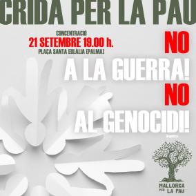 Més de 160 personalitats de la vida social i cultural de Mallorca s’han adherit a la 'Crida per la Pau', que tendrà lloc aquest dissabte, 21 de setembre, Dia Internacional de la Pau, per manifestar-se «contra les guerres, el genocidi i per un alto el foc immediat».