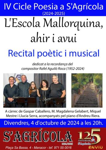 L'acompanyament musical anirà a càrrec del pianista Andreu Riera Gomila, concertista reconegut i professor del Conservatori Superior de les Illes Balears. A més, el recital estarà dedicat a la memòria del compositor manacorí Rafel Aguiló Roca, una figura clau en els actes culturals de S'Agrícola.