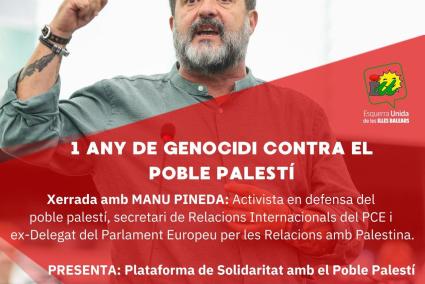 Esquerra Unida de les Illes Balears (EUIB) organitza per a aquest dilluns, 7 d'octubre, una xerrada sobre el genocidi contra el poble palestí amb la presència de Manu Pineda, antic delegat del Parlament Europeu per a les relacions amb Palestina.