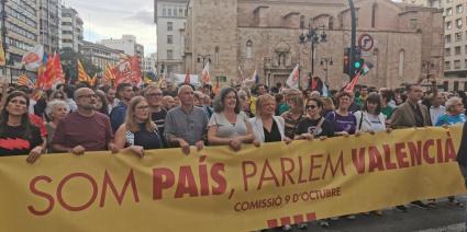 Milers de persones han participat, aquest dimecres a València, a la manifestació reivindicativa convocada per la Comissió Nou d’Octubre. Amb el lema 'Som País, parlem valencià', els organitzadors protesten enguany contra totes les retallades en drets lingüístics.
