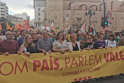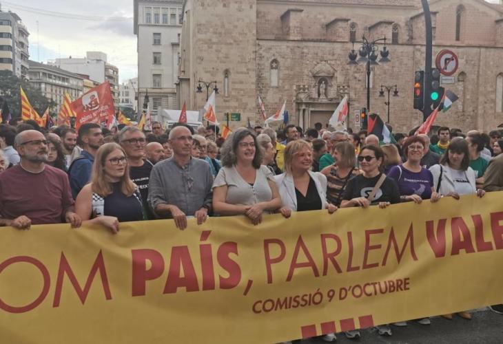 La pancarta de la Comissió Nou d’Octubre, encapçalada entre més per la presidenta d’Acció Cultural del País Valencià, Anna Oliver; la presidenta de la Societat Coral el Micalet, Gemma Pasqual; la presidenta d’Escola Valenciana, Alexandra Usó; la secretària general de Més Compromís, Amparo Piquer; la presidenta de Decidim, Zhaia Guidoum; el president de l’ANC, Lluís Llach; Àgueda Micó, diputada al congrés espanyol per Compromís, i Ximo Granya, d’Esquerra Republicana.