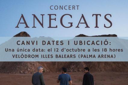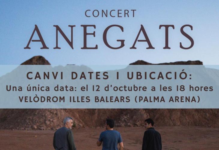 El Consell de Mallorca trasllada al Velòdrom Illes Balears (Palma Arena) el concert de comiat d’Anegats i l'unifica en una única data. La institució insular informa que el concert previst inicialment per als dies 12 i 13 d'octubre a La Misericòrdia, es trasllada al Velòdrom Illes Balears i s'unifica en un únic esdeveniment que tendrà lloc el 12 d'octubre a les 18 hores.