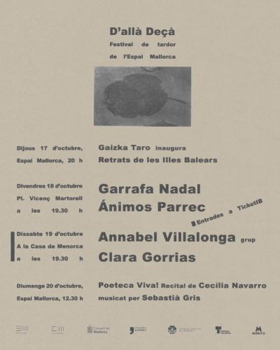 Garrafa Nadal, Ánimos Parrec, Annabel Villalonga grup i Clara Gorrias són els escollits per a tocar a la segona edició del D’Allà Deçà de l’Espai Mallorca i la Casa de Menorca de Barcelona. El festival, que se celebrarà a les dues seus des de dijous, 17 d'octubre, a diumenge, 20 d’octubre, és impulsat per l’associació sense ànim de lucre Crits i Renou per les Illes Balears.