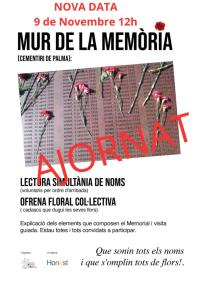 Memòria de Mallorca ha anunciat l'ajornament de l'acte d'ofrena floral i lectura de noms al Mur de la Memòria, que inicialment estava previst per aquest cap de setmana. L'acte commemoratiu es trasllada al diumenge 9 de novembre a les 12 h en respecte i suport a les víctimes i afectats per les greus inundacions provocades per la DANA d’aquests darrers dies.